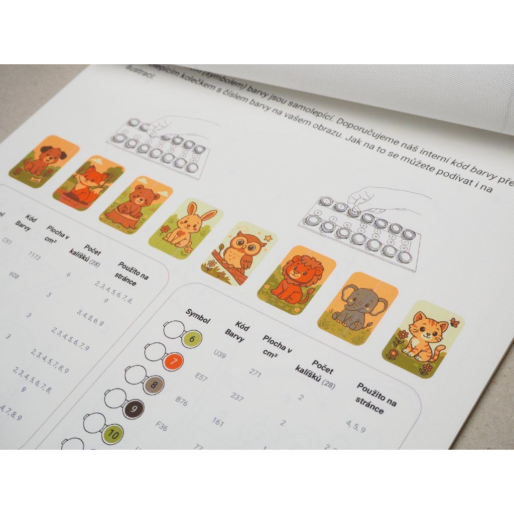 Zawiera 8 motywów o jednej tematyce, farby akrylowe, pędzle, uchwyt na farby przymocowany do sztywnej tektury i spinacz, który wszystko trzyma razem. Wystarczy otworzyć, wziąć pędzel do ręki i zacząć tworzyć!